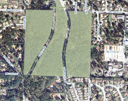 Juanita Woodlands is a 40 acre urban forest on the west side of Finn Hill, spanning across Juanita Drive and Holmes Point Drive between N.E. 116th and N.E. 118th streets. If you stroll through the park, you will see Douglas fir, Western Red Cedar, Big Leaf Maple, Cottonwood, Madrona, Huckleberry, Sword Ferns and many other tree and plant species.