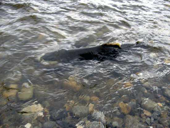 “We saw a commotion when we were north of the mouth (of Denny Creek) and all came to investigate; we never expected to see a spawning salmon!” said LeBlanc. “The salmon was coming up the mouth of the creek, so we could see it splashing in the ‘open’ which is what caught our attention.”
