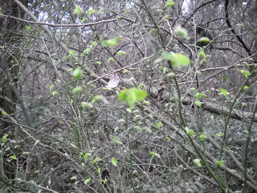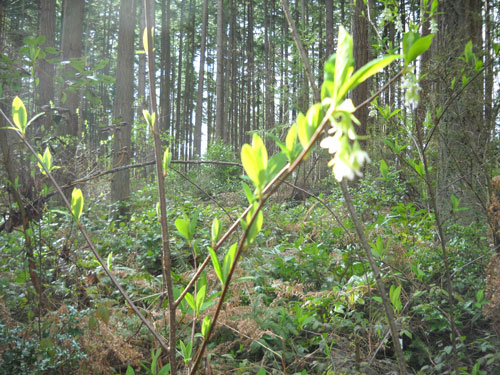 The spring Equinox marked the half way point between the winter and summer solstice. Those long nights of winter are over. At the Equinox, nights and days are about equal length. The name Equinox is derived from the Latin “aequus” (equal) and “nox” (night). The axis of the Earth is increasing its tilt relative to the sun, and the length of daylight rapidly increases. The northern hemisphere begins to warm significantly, causing new plant growth to “spring forth”, giving the season its name. The Juanita Woodlands is showing the first signs of spring: Small light green leaf buds are on Paper birch and Oregon ash trees planted Jan 2011 and 2012, New bright green leaves are budding out on native huckleberry bushes and native Indian plum bushes. Indian plum also showing hanging clusters of small white flowers.