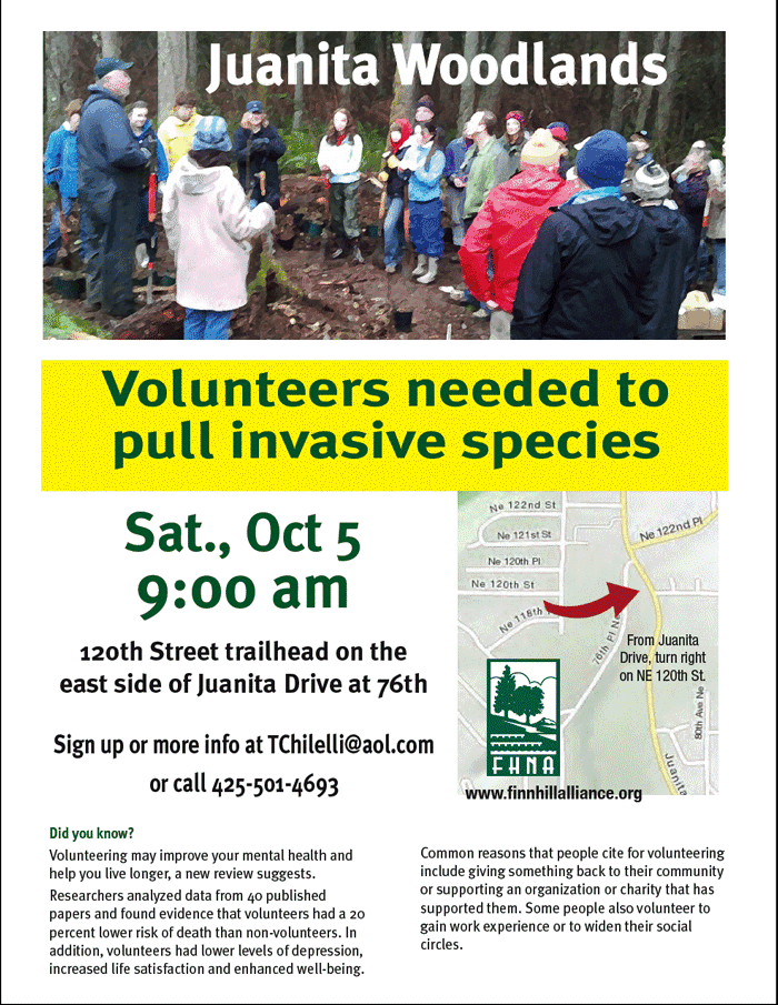 This clean-up event is one of the many important events in FHNA’s Juanita Woodlands 5 Year Reforestation Plan (click link to view PDF). Now in the fourth year of the Plan, 4,500 trees have been planted by volunteers throughout the Park. Volunteers have removed armloads of BAD invasive plants from the park. To whom do we owe the success of this program?  VOLUNTEERS! That’s YOU! Come help on the morning of October 5th! Have the satisfaction of helping to create a healthier and more beautiful Woodlands! Bring your family. Bring a friend. See you at 9:00 a.m. on October 5th.