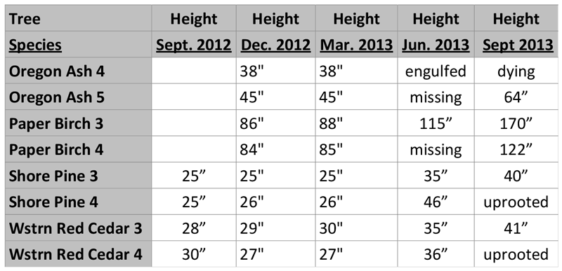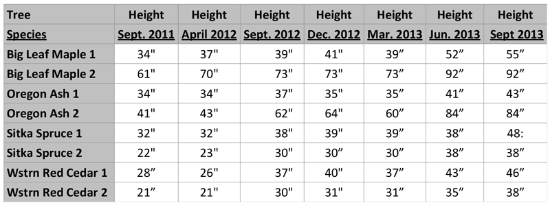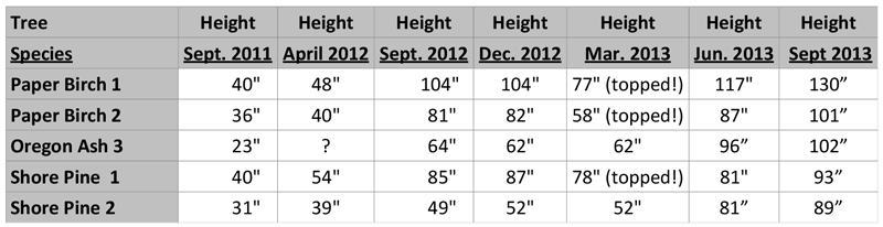 How fast does a tree grow? Do different tree species grow at different rates? See the Tree Height Measurement Log below. I took the most recent measurements on Saturday Sept 21, 2013. (Oops, no photos of trees this time. I recently dropped my camera and broke the lens.)