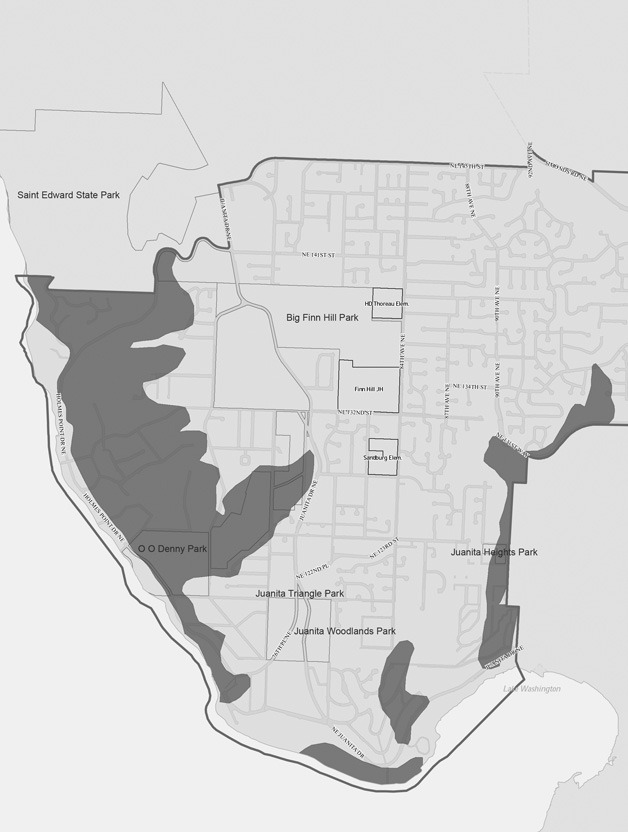 In dark grey are the areas that are landslide hazardous on Finn Hill and Goat Hill in Kirkland In dark grey are the areas that are landslide hazardous on Finn Hill and Goat Hill in Kirkland
